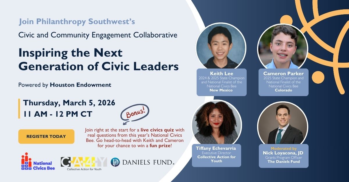 PSW is excited to bring back Cameron Parker, the 2025 Colorado Civics Bee State Champion and National Civics Bee Championship Finalist, for March's session within our Civic and Community Engagement Collaborative! Cameron will also be joined by Keith Lee, the 2025 New Meixco Civics Bee State Champion and National Civics Been Championship Finalist, and the Executive Director of the organization Collective Action for Youth, Tiffany Echevarria. Together, they will explore how early investment in civic learning, leadership development, and real-world engagement equips young people not only to understand democracy—but to actively strengthen it.