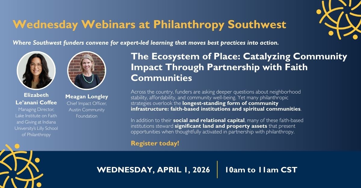 Join Elizabeth Le'anani Coffee, Managing Director at the Lake Institute on Faith and Giving at Indiana University's Lilly School of Philanthropy, and Meagan Longley, Chief Impact Officer at the Austin Community Foundation, to learn more about this timely topic with practical takeaways for all grantmakers within their own communities across the Southwest.